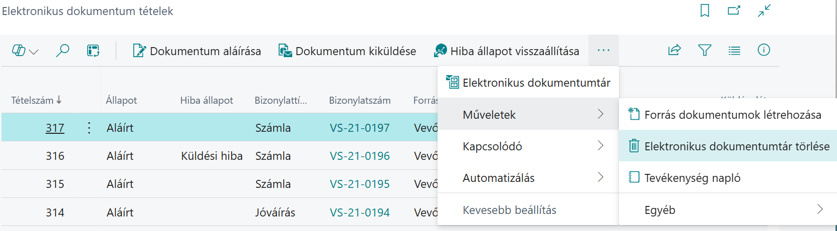 A tárhely felszabadítás manuális elindításhoz lépjünk be az Elektronikus dokumentum tételek listába. Itt a menüből elindíthatjuk az Elektronikus dokumentumtár törlése műveletet: